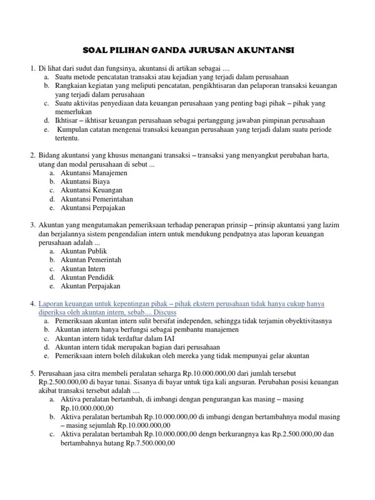 Soal pilihan gandates perangkat desa pdf kali ini soal yang diberikan adalah soal latihan . Berikut di bawah ini contoh soal uts ekonomi kelas xii semester 1 beserta jawabannya untuk siswa sma/sederajat. Contoh soal beserta jawaban ekonomi kelas xi semester . Bidang akuntansi yang menyediakan laporan keuangan sebagai informasi ekonomi bagi para pemakainya adalah. Latihan soal pilihan ganda materi akuntansi keuangan menengah beserta.